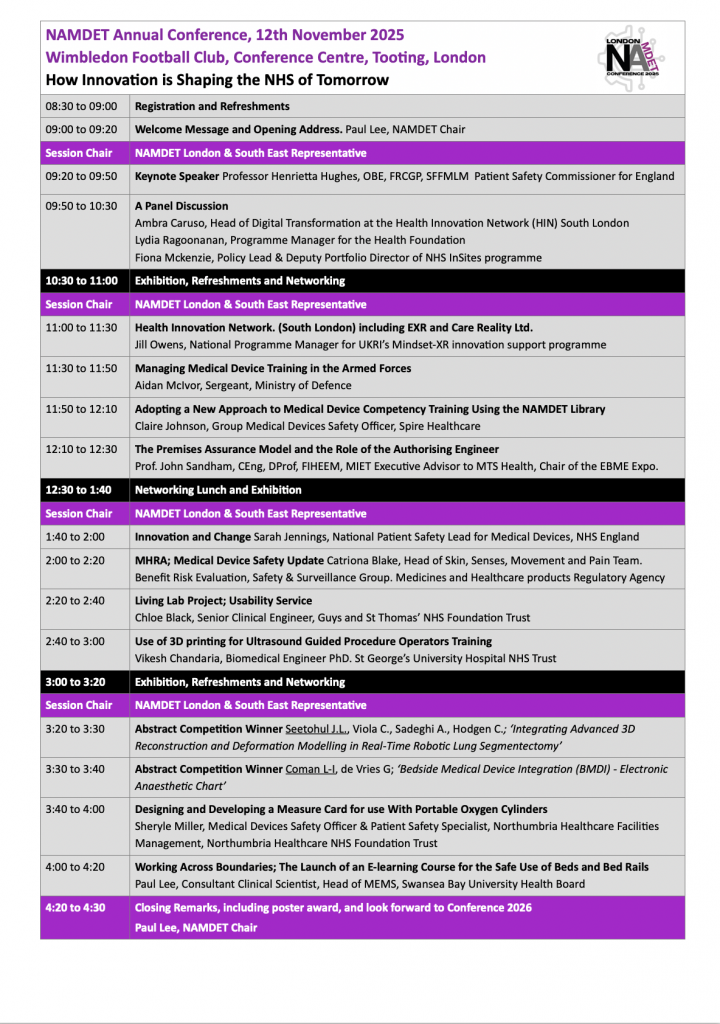 Speakers from NHS, Patient Safety Commissioner, Health Innovation Network, MHRA, NHS England, plus experts in the medical device management and device training field.